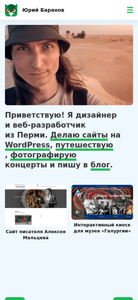 | AI-анализ | This website is a personal portfolio and blog of a designer and web developer named Yuri Baranov from Perm, Russia. The site includes a blog, portfolio, and contact information. Yuri specializes in creating websites using WordPress, travels, takes photographs of concerts, and writes in a blog. His contact details are mail@yhunter.ru, +7-902-83-588-30, telegram, codepen, 500px, instagram, and youtube. Some of his completed projects include a website for a cafe, a tipping service, a website for a construction company, a writer's website, and an interactive museum kiosk. He has also worked on web versions of books and a site for a group. His blog features fresh content, including photographs from a Master group concert on September 22, 2025, and |