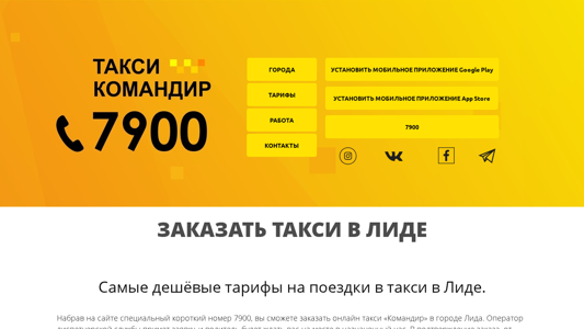 | SEO-описание | Заказать такси онлайн в Лиде. Короткий номер 7900. Скачать мобильное приложение такси Командир. Бонусная программа скидок. Расчёт по карте. Самые низкие тарифы и цены в городе. Работа в такси. |