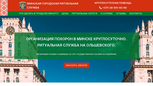 | SEO-описание | Минская городская ритуальная служба на улице Ольшевского оказывает полный комплекс ритуальных услуг круглосуточно. Поддержка, помощь и организация похорон без выходных. |
