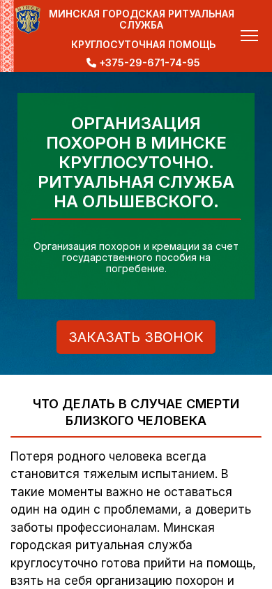| AI-анализ | The portal Mingorital.by is a 24/7 funeral service provider located on Oльшевского Street in Minsk, Belarus. They offer a full range of funeral services, including support, assistance, and organization of funerals without weekends. Keywords: organization, funeral, address, services, body, all, ritual, service, ritualistic, ritualistic services, documents, casket, price, about, reviews, contacts. The website provides information on funeral organization in Minsk around the clock. Mingorital.by offers funeral and cremation services with the help of state funeral benefits. Upon the occurrence of a tragic event, contact the duty specialist at +375-29-613-93-60 for assistance. The first step is to call the ritual agent who will assess the situation and arrange the necessary documents and funeral procedures. The second |