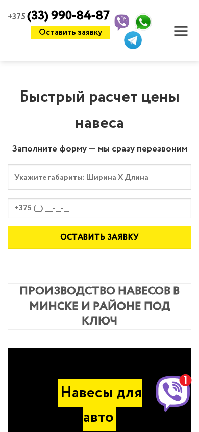 | AI-анализ | --- The website is for a producer of custom-made canopies in Minsk, Belarus. Prices start at 240 BYN per square meter. The company offers various types of canopies including those made of polycarbonate, metal tiles, and flexible tiles. The website provides a guarantee and installation services. Contact information includes a phone number and an invitation to reach out via Viber, Telegram, and Whatsapp for an online quote. The address of the production site is listed as in the Minsk region, with business hours from 9am to 6pm, Monday to Friday. The website features a catalog of projects, popular canopy styles, and a production blog. Canopies for cars, homes, and gardens are all available, along with special projects such as arches, consoles, and garages. A calculator is provided for quick price estimates. The production |