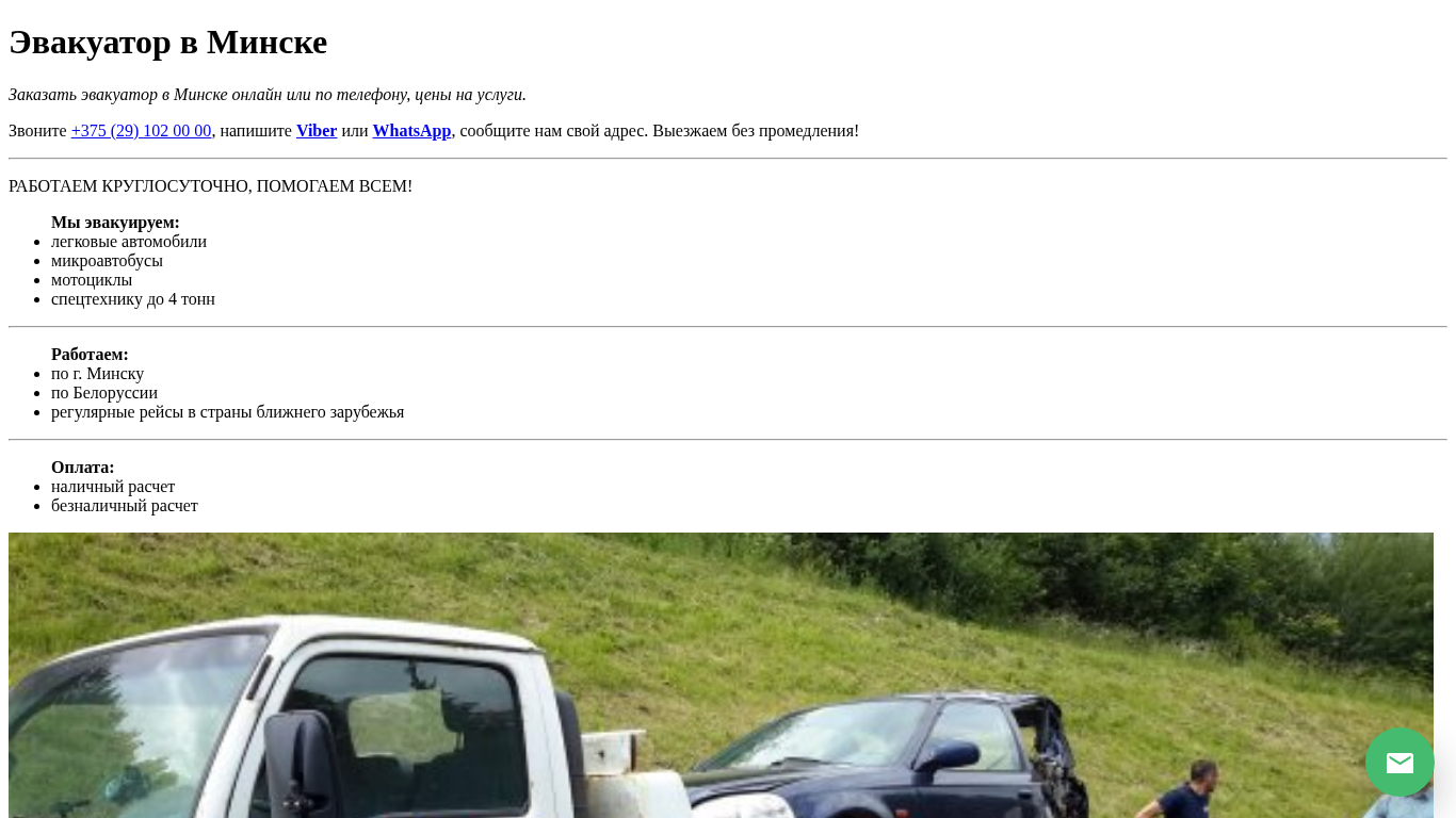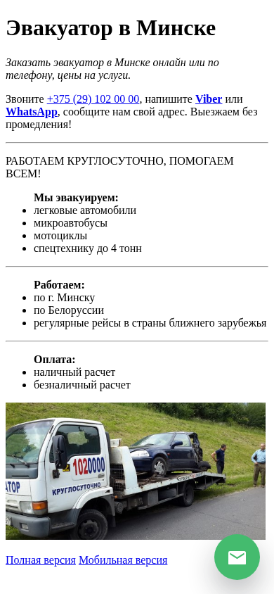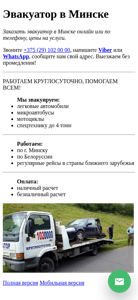 | AI-анализ | --- This online resource is a wrecker service in Minsk, Belarus, providing round-the-clock car evacuation. Users can order the service online or via phone, with given contact numbers and options for Viber and WhatsApp. The website mentions that they offer assistance for various vehicle types, including cars, microbuses, motorcycles, and special equipment up to 4 tons. They operate not only in Minsk but also in Belarus and provide regular re-rides to nearby countries. Payment methods include both cash and non-cash transactions. |