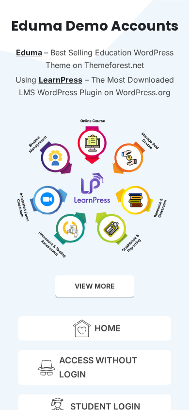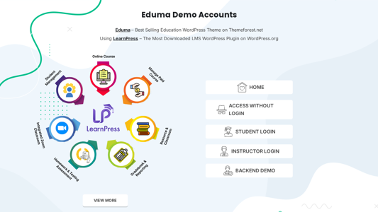 | AI-анализ | This website is for the Eduma Demo Accounts of the best-selling Education WordPress theme, Eduma, available on Themeforest.net. The site provides access to the homepage, student login, and instructor login pages without requiring a login. Additionally, it offers backend demo access for further exploration. The Eduma theme uses the LearnPress plugin, the most downloaded LMS (Learning Management System) WordPress plugin, for creating and managing educational content. |