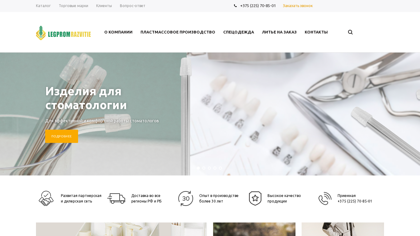 | AI-анализ | The web project "ЗАО «Легпромразвитие»" is a Belarusian company specializing in plastics production, instrument manufacturing, and sewing. The website offers information on the company, its news, vacancies, and contact details. The top keywords for this domain include 'Legpromrazvitie', 'plastics', 'pressforms', and 'ecoteck'. The site also features sections on water drainage systems, sports and protective coverings, workwear, and footwear. The company boasts an extensive network of partners and dealers, with deliveries to all regions of Russia and Belarus. The site includes a catalog of products, including Ecoteck standard drainage pipes in various sizes, sports and protective coverings, and various items for the home and leisure. The company has over 30 years of experience in production and is known for |