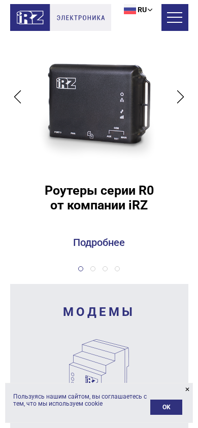 | AI-анализ | The portal iRZ Электроника is a Belarusian business website dedicated to the promotion and sale of electronic devices. The title of the site is 'iRZ Электроника' and the description includes keywords related to the company, electronics, products, modems, routers, and support. The top words indicate the presence of sections on the site for news, blog, careers, products, modems, routers, systems monitoring and search, accessories, and configuration of devices. The site offers industrial 2G modems with DIN rail mounting, support for two SIM cards, parallel RS232, RS485, GPIO, and a built-in 220V power block. Other products include affordable industrial 3G or 4G routers with Wi-Fi and one Ethernet port, and a 3G/GSM/GPR |
