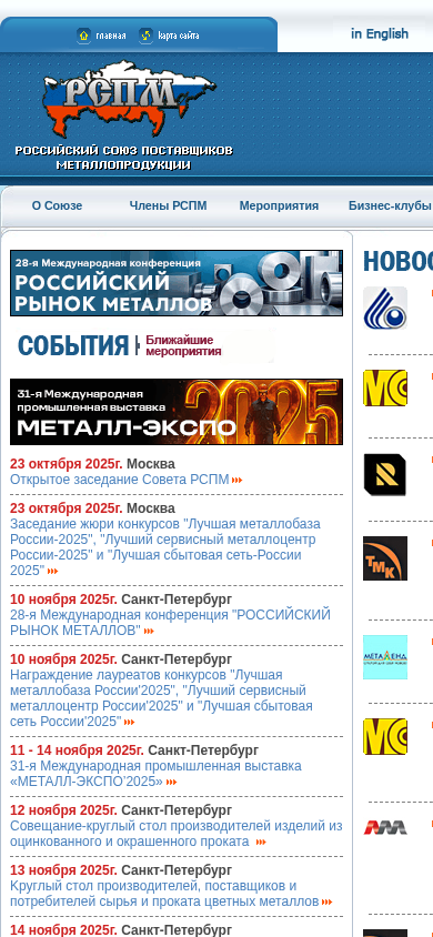 | AI-анализ | The portal Russian Union of Metal Suppliers | Russian Union of Metal Suppliers (rspm.ru) is a business-to-business platform focusing on the Russian metal market. The website provides information on the Russian Union of Metal Suppliers (RSPM), its goals and tasks, history, and regional activities. It includes sections on banners, news, contacts, directory, members, maps, price lists, events, and business forums for various regions in Russia. The website features upcoming and past news, conferences, and exhibitions related to the metal industry, as well as a video channel and opportunities to propose business clubs. The RSPM website also includes sections on debtors and partnerships, and offers various announcements and declarations. The site's calendar lists several events taking place in Moscow, Sanкт-Петербург, and other Russian cities from October to November 2025, including open sessions |