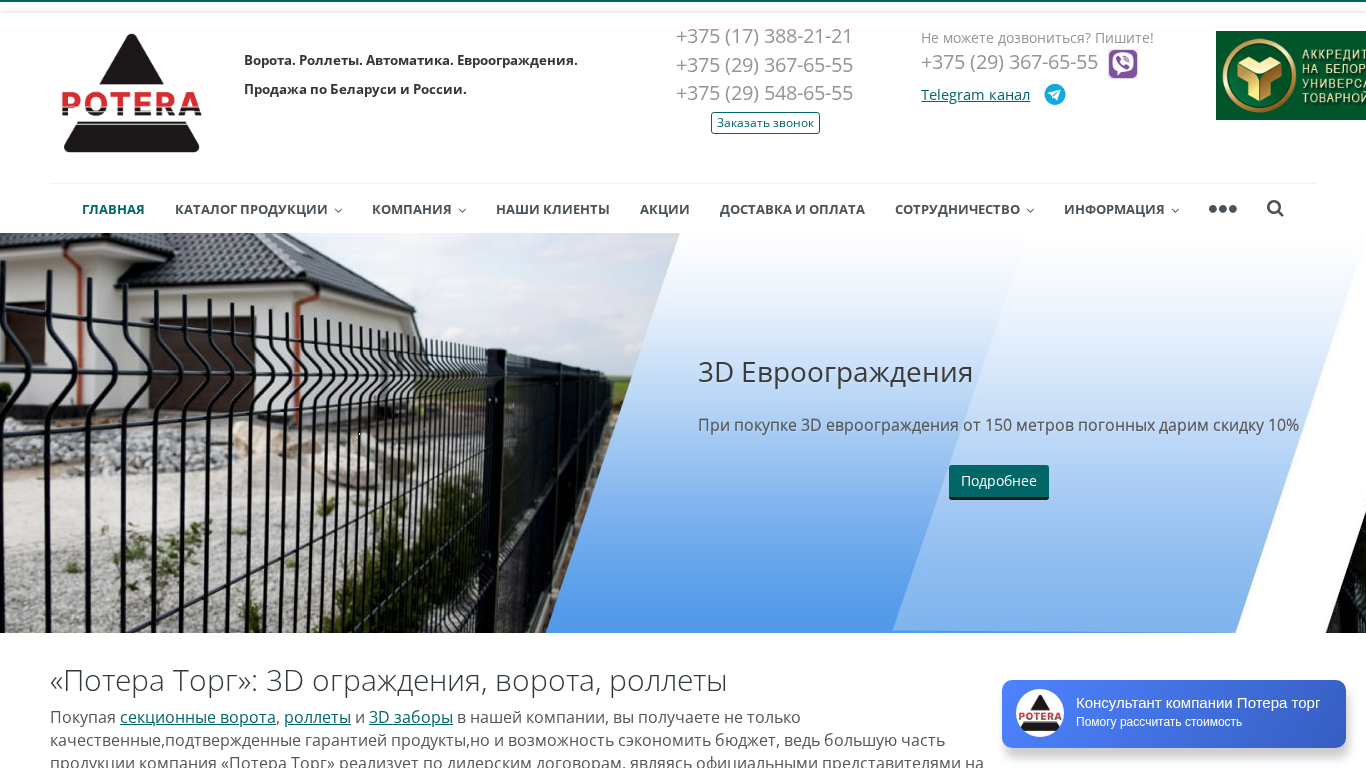| SEO-описание | «Потера Торг» предлагает 3D ограждения, ворота, роллеты. Быстрая доставка и качественный монтаж. Звоните: +375 (29) 367-65-55! |