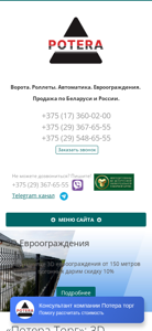 | AI-анализ | --- This online resource is the website for Company Потера Торг, offering 3D fencing, gates, and rollers. Quick delivery and quality installation are promised. The phone numbers provided are: +375 (29) 367-65-55. The website also mentions phone numbers +375 (17) 360-02-00 and +375 (29) 548-65-55 for making a call request, and +375 (29) 367-65-55 for a Telegram channel. The keywords associated with this site include 'Company Потера Торг', '3D fencing', 'gates', 'rollers', 'European fencing', and various phone numbers. The top words used on this site are 'gates', 'doors', ' |