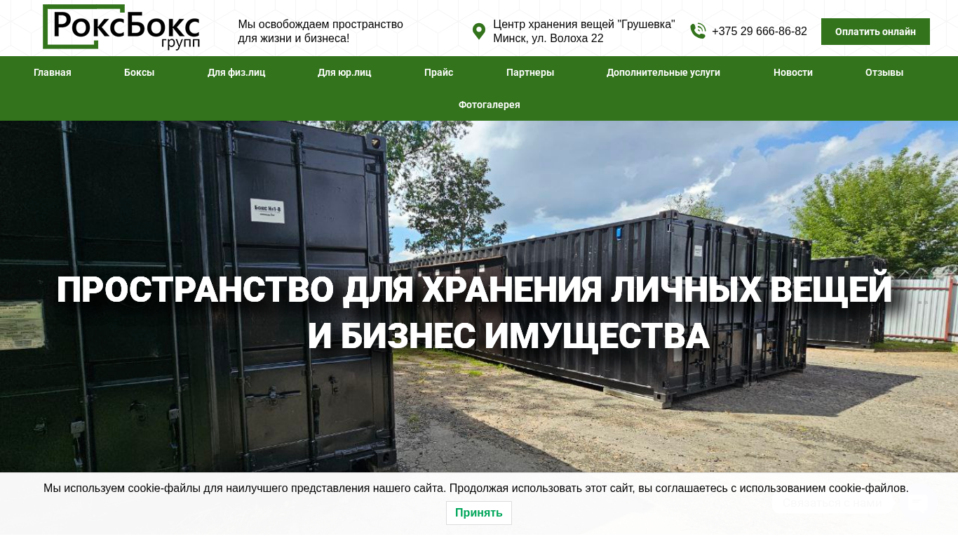 The portal Roksbox.by is a self-storage facility located in Minsk, Belarus, with different sizes of storage units for both personal belongings and business assets. The company offers 24/7 access to individual boxes, ensuring convenience for customers. Security measures include round-the-clock surveillance and protection. The facility is situated near metro stations "Ploshchad Frantsishka Bogushevich" and "Grushevka," making it easily accessible. The self-storage units come in various sizes: 2.7 m² with a volume of 6 m³, 4 m² with a volume of 9.6 m³, 5 m² with a volume of 12.1 m³, and 6 m² with a volume of 15.3 m³. Prices start from 115 Belarusian rubles per