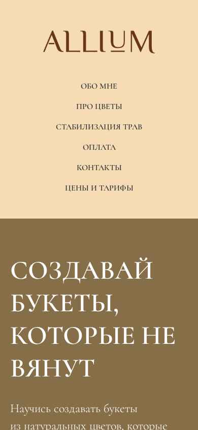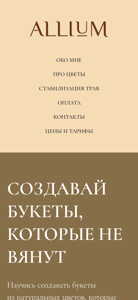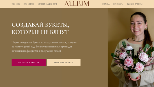 | AI-анализ | This website is a floristry education platform focused on teaching users how to create and maintain bouquets using stabilized flowers and plants. The homepage title is "Главная" (Main). The description is blank. Keywords include "курс" (course), "купить" (buy), "цветы" (flowers), "стабилизации" (stabilization), and "трав" (plants). The top_words list includes various words related to flowers, learning, and the website's offerings. The website is operated by someone named Masha, who has over 10 years of experience in the floristry industry and previously ran a flower shop before transitioning to working only with stabilized flowers and plants. The website offers both free and paid courses on stabilizing plants at home and creating bouquets using these materials. The page also includes information on what |