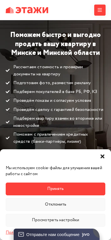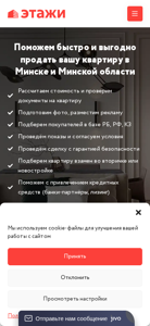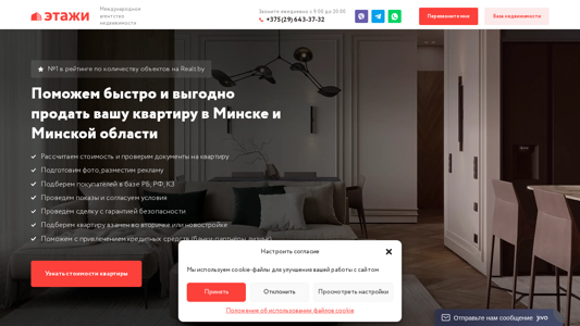 | AI-анализ | The web project "Этажи (Etagi)" is a real estate agency based in Belarus, Minsk, with a 22-year track record of helping people sell their apartments with minimal hassle. Keywords associated with the site include apartment sales, deals, floors (or levels), real estate, property price, apartment, cost, time, apartment building, Minsk, region, and sell. The site offers services for calculating the value of a property and verifying documents for a sale. It also provides photo preparation and listing, attracts potential buyers from a database in Belarus, Russia, and Kazakhstan, arranges viewings and negotiates terms. The site guarantees the safety of the transaction and offers the option to exchange a sold apartment for another or a new one. The site uses cookies for site improvement and preference storage, and for anonymous statistical purposes. The contact number is listed |