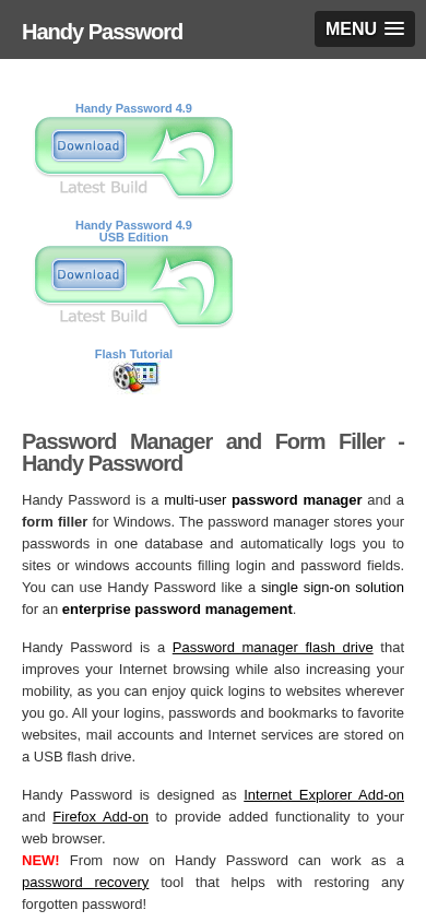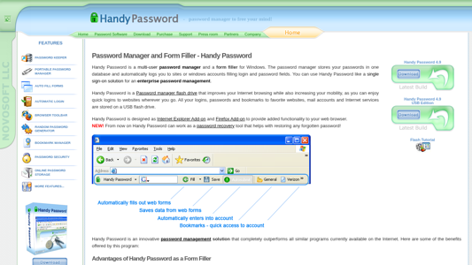 | AI-анализ | The website, Handypassword.com, offers a multi-user password manager and form filler software for Windows. The password manager securely stores users' passwords and automatically logs them into websites or windows accounts by filling in login and password fields. Handy Password functions as a single sign-on solution for enterprise password management. The software comes in a USB edition, allowing users to store all their logins, passwords, and bookmarks on a USB flash drive for increased mobility and quick logins wherever they go. Handy Password is designed as an Internet Explorer and Firefox add-on to enhance web browsing functionality. Additionally, Handy Password now works as a password recovery tool to help restore forgotten passwords. The password manager software provides numerous benefits, including time savings from automated form filling and increased security from storing passwords in one secure location. |