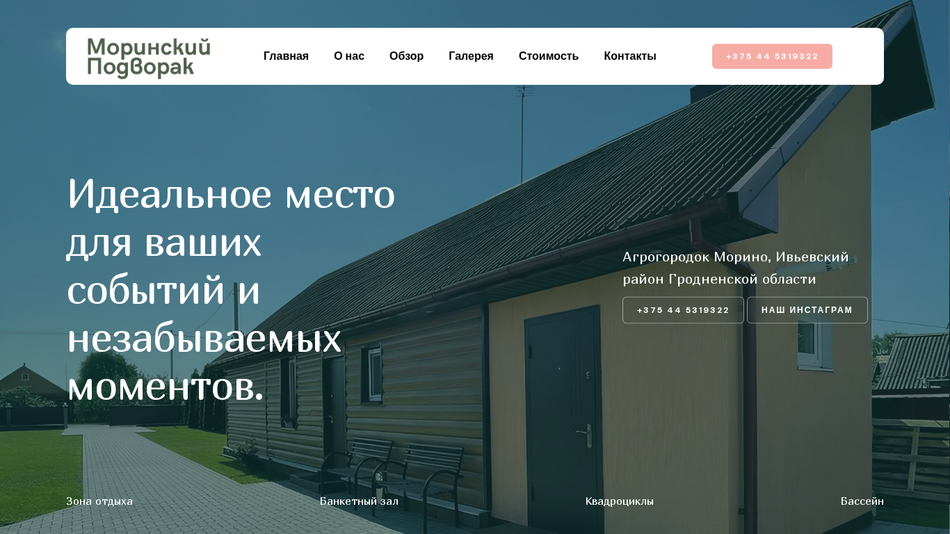 | SEO-описание | Аренда усадьбы Моринский Подворак посуточно: идеальное место для свадьбы, корпоратива или семейного отдыха. Снять дом для праздника или выходных. Банкеты до 50 человек, баня, квадроциклы, бассейн, красивая природа. Бронируйте сейчас! |