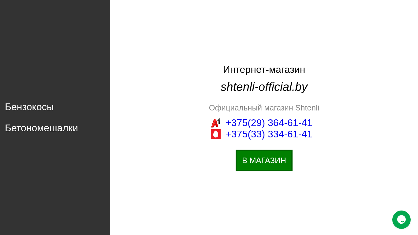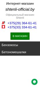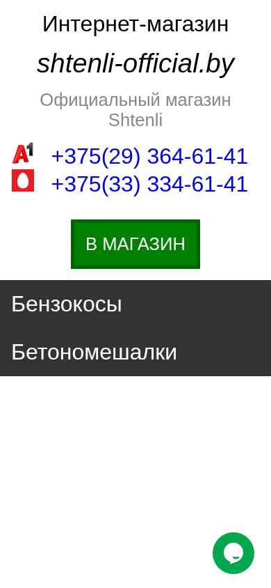 | AI-анализ | The portal shtenli-official.by is an official online store for Shtenli branded products. The website sells benzoкосы (fuel tanks) and бетономешалки (concrete mixers). Users can contact the store using two provided phone numbers: +375(29) 364-61-41 and +375(33) 334-61-41. The store is labeled as an internet-magazine, but it functions as an e-commerce site. The title of the website is "Официальный магазин Shtenli" and the description includes the keywords "official," "shtenli," "internet-magazine," and "375." The top words suggest that the main focus of the site is on the "magazine" aspect, |