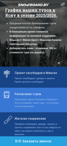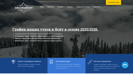| AI-анализ | --- The portal snowboard.by offers weekly ski tours with instruction in Bukovel, Ukraine, and Jasna, Slovakia. They provide snowboard and ski rental, repair, and sales. The menu includes a shop, rental, repair, news, contacts, and a schedule of tours in the 2025/2026 season. The company has been organizing active leisure for over a decade and prides itself on being a team of professionals. The contact information includes a phone number, email address, and physical location in the Moscow-Venetian Trade Center in Minsk. The tours consist of a trip from Minisk to Brest, Warsaw, Krakow, Lipovsky Mikulas, and participants are responsible for their transportation to the destination, for which there is a discount of 70€ on the tour price. The shop sells snowboards, clothing, |