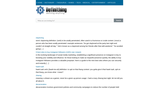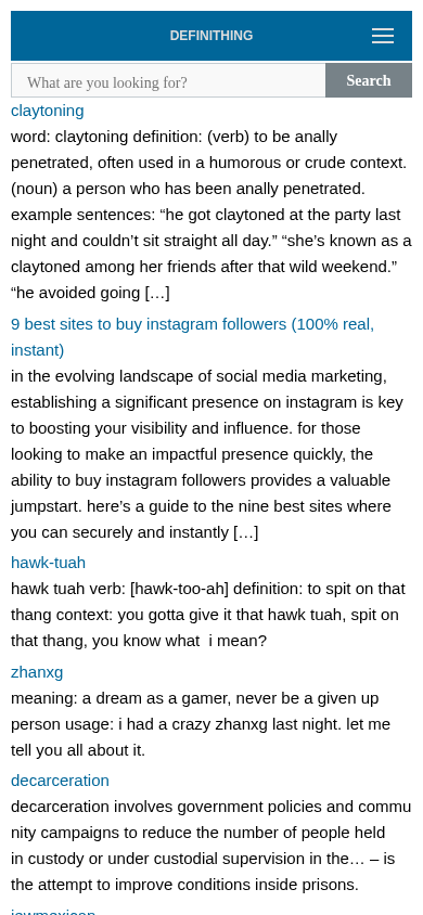 | AI-анализ | This website is a collection of definitions, contexts, and examples for various words and phrases, some of which have explicit or vulgar meanings. It includes sections for a dictionary, thesaurus, and articles, as well as a submit feature for users to add their own entries. The top_words data reveals that common words on the site include "and," "the," "that," "buy," "you," and various forms of the words "f-ck" and "claytoning," which refers to anal penetration. Other entries include "hawk tuah," a term for spitting on something, and "ZhanXG," a dream or determination as a gamer. The site also includes entries for "decarceration," a term for reducing the number of people in custody, and "Jewmexican," a term for a person who is Mexican in race and Jewish in religion. The |