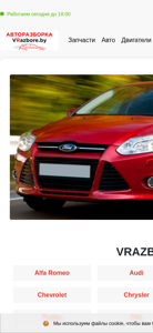 | AI-анализ | --- The portal VRAZBORE.by from Minsk is an online marketplace for used auto parts in Belarus. It offers over 1000 parts available for purchase in Minsk and across Belarus. Users can search for parts by car brand, model, generation, and engine type or fuel type. The website provides information on the availability of parts, and offers consultations. The top search terms include 'benzin' (gasoline), 'mkpp' (manual gearbox), 'наличии' (availability), 'консультация' (consultation), and 'цена' (price). The website also features sections for specific auto brands such as Alfa Romeo, Audi, BMW, Chery, Chevrolet, Chrysler, Citroen, Daewoo, Dodge, Fiat, Ford, Great Wall, Honda |