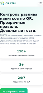 | AI-анализ | This website, titled "QR CTRL," is a control system for beverage pouring and analytics specifically for the HoReCa (Hotel, Restaurant, Cafe) industry. The website highlights its transparency, client satisfaction, and integration with POS (Point of Sale) systems. QR CTRL automatically applies 'no-limit' rules, manages taps/counters, and provides clear reports at points and shifts. With over 150 active systems nationwide, QR CTRL works with three major chains in the industry and offers 24/7 support. The system includes QR-access to pouring, individual and guest QR, temporary or repeat limits, POS integration, and anti-fraud security features. Reports and analytics are also provided. The guest scans a QR code from their check or app at the pouring station, and the |