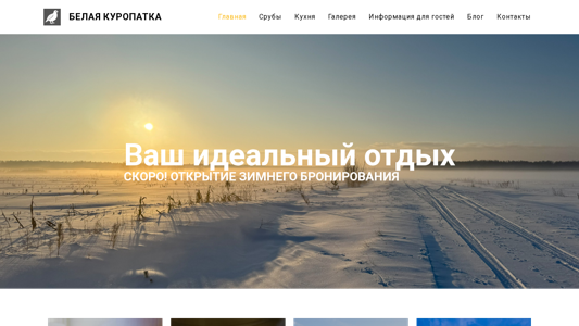 | AI-анализ | This website is for a business offering accommodations in cabins or log structures, referred to as "srubs," in Belarus. The main page, titled "Главная," provides information about the availability and opening dates for three cabins named "Панорама," "Медведь," and "Дом Писателя." "Панорама" is undergoing clean-up and will be available for booking from December 15, 2025. "Медведь" is in the process of being dried and will be ready in the end of 2026. "Дом Писателя" is also in the process and will be available in the same year. The site mentions a special offer for early winter booking and an ongoing cleaning and landscaping project. Keywords related to the business include "srubs," "kitchen |