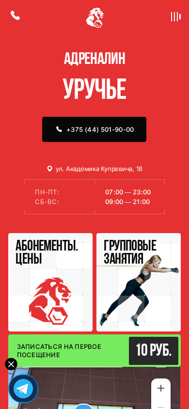 | SEO-описание | ✔Тренажерный зал, фитнес-клуб Адреналин в Уручье. Только современное оборудование и лучшие цены на занятия в тренажерном зале. Скидки и акции. Звоните!☎✔ Приходите тренироваться в фитнес - клуб Адреналин! |