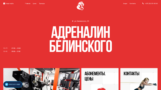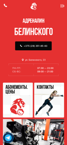 | AI-анализ | The website is for a fitness center named Adrenaline located on Belinsky Street, in the Soviet District of Minsk, Belarus. The website provides information about the modern equipment and affordable prices for training sessions, as well as discounts and ongoing promotions. Users can contact the center at the phone number +375 (29) 351-85-83 for more information or to book an appointment. The website also features sections for clubs, prices, trainers, and ongoing promotions. The training center offers comfortable facilities with climate control and showers. New promotional offers are regularly introduced, and an option for purchasing a 'Halva' card for discounted rates is available. The trainers at Adrenaline are highly qualified, with degrees in physical education and sports, and extensive experience in various training methods. They offer individualized training programs and techniques, as well as general fitness |