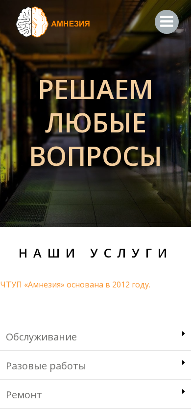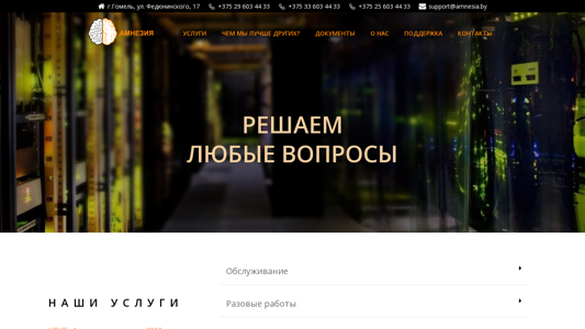 | AI-анализ | --- The web project "Amnesia.by" offers IT equipment and technology maintenance and repair services in Belarus, including computers, peripherals, and printer cartridge refills. The company, founded in 2012, provides on-site and remote support, as well as one-time services with hourly and complexity-based pricing. Their team consists of experienced professionals who aim to resolve any issues quickly and efficiently. The website offers downloadable documents about their services, tariffs, and public service contracts. The company's motto is to provide high-quality, affordable services, saving clients on equipment, training, and taxes. The contact information includes phone numbers and email for support inquiries. |