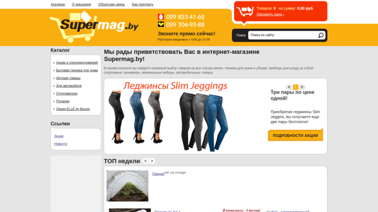 | AI-анализ | --- This online resource is Supermag.by, an e-commerce website selling various items for everyday life. Products include household appliances, fitness equipment, and kitchen technology. The website provides a shopping cart, information about the store, and a way to contact customer service. The phone numbers for customer service are (029) 853-41-62 and (029) 304-93-88. The store operates daily from 9:00 to 21:00. Currently, there are no items in the cart and the total cost is 0,000 rubles. Some items that are not available on the website include a paraffin, a paraffin heater without a cover, a motion-sensor lamp named "Super Light," and a corrective bra named "Ahh Bra." Additionally, the website offers news and detailed information on |