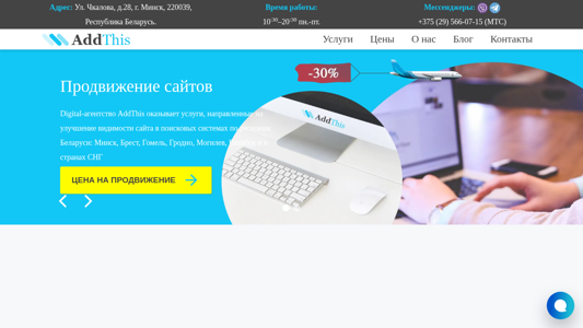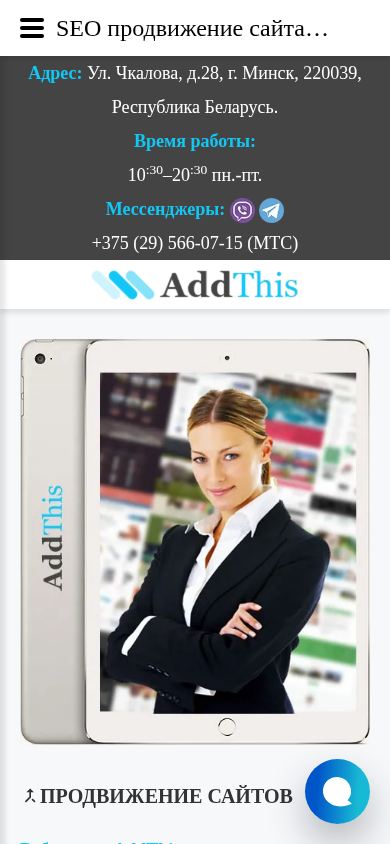 | AI-анализ | The website is a digital marketing agency based in Minsk, Belarus, offering services for the improvement of website visibility in search engines for regions in Belarus and countries in the CIS. They provide SEO promotion, website development, and site support. The agency is named AddThis and their services include website optimization, ad setup, web design, site creation, corporate resources, and site audit. They have different tariffs: Start, Optimal, and VIP. The website is open from 10:30 AM to 8:30 PM, Monday to Friday. Their contact details include a mobile number for MTS. AddThis also offers SEO promotion services for cities in Belarus such as Minsk, Brest, Gomel, Grodno, Mogilev, and Vitebsk and in countries in the CIS. Another service they provide is website development by web studio "Э |