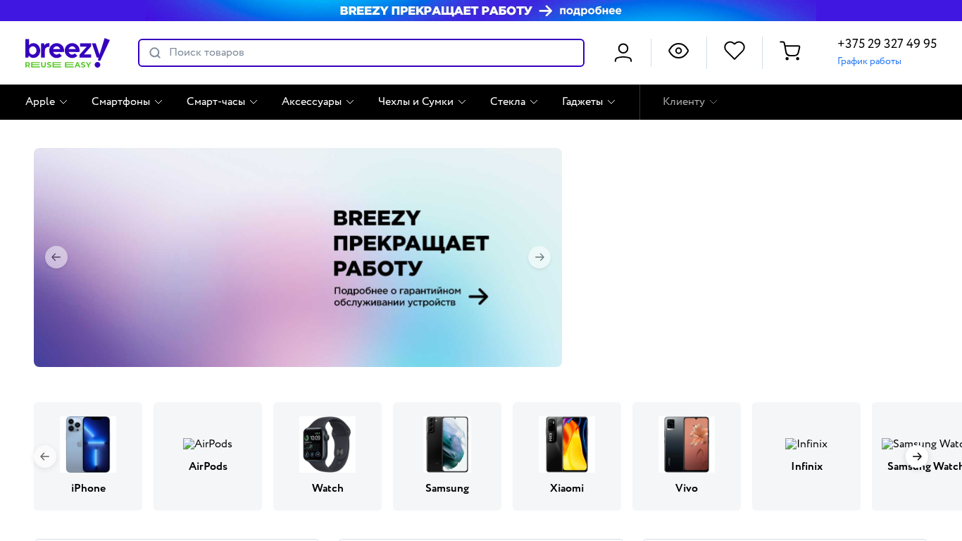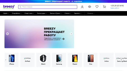 | AI-анализ | --- The web project 'Breezy.by' is an e-commerce platform for buying and selling electronics in Belarus. Users can browse the catalog of goods or use the search function to find specific items. The website offers a trade-in program, a one-year warranty, financing and credit options for up to 48 months, and only verified products. The catalog includes categories for smartphones, smartwatches, accessories, and more from brands such as Apple and Samsung. Users can add items to their wish list and manage their orders through their personal cabinet. The website also provides information on delivery and payment methods, return and exchange policies, and frequently asked questions about the company. Contact information includes a phone number and hours of operation. |