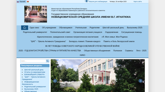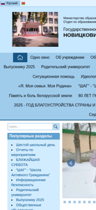 | AI-анализ | This online resource is the official website for Novicickaia Sredniaia Shkola Imeni V.G. Ignat'yuka (Novicickaia Middle School Named After V.G. Ignat'yuka) in Belarus. The title of the website is "Новицковичская средняя школа" (Novicickaia Middle School). The description contains keywords such as "образования" (education), "новости" (news), "школа" (school), "беларуси" (Belarus), and "имени" (named after). The top_words include "2025" (twenty-fifth), "читать" (to read), "далее" (further), and "родительский" (parental). The website has a standard color |