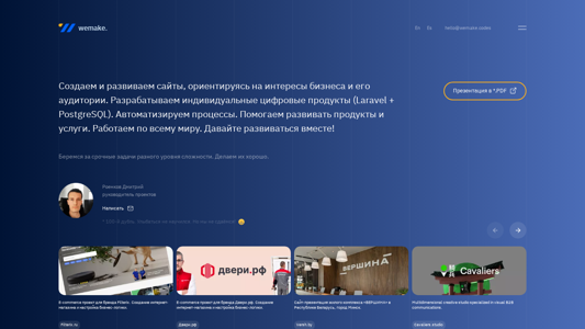 | AI-анализ | The website is a digital solutions development company based in Belarus, offering services for creating corporate and B2B websites, complex e-commerce platforms, and providing support and development for existing sites using technologies like Laravel and Zend framework. They also specialize in creating business websites on the Bitrix platform, and offer optimization for Google page speed. The company, which has a presence in Russia, has worked on numerous projects, including the development of e-commerce sites for brands Filterix and Двери.рф, as well as site presentations for real estate developments in Belarus, such as Versh.by and Comfortpark.by. The site also features a portfolio of completed projects, including corporate sites for Integral Systems and Infrost.ru, and an administrative panel and CRM for a tourist service. The company's contact information is provided for inquiries. |