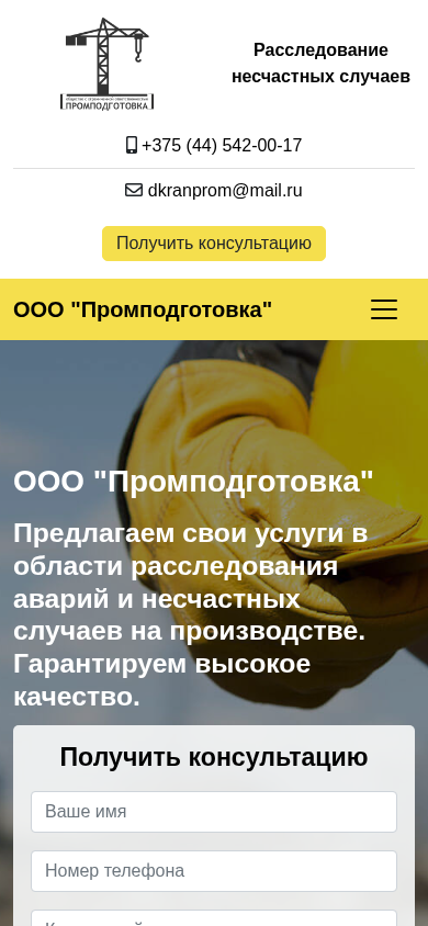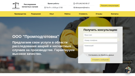 | AI-анализ | The portal OOO "Промподготовка" offers services in the field of investigating industrial accidents and work-related incidents. With over a decade of experience and accreditation in occupational safety, we provide high-quality and timely solutions for determining the causes of accidents, ensuring the interests of our clients throughout the investigation process, and handling all necessary documentation. We operate throughout Belarus and offer various methods of payment. Our in-house accredited laboratory and extensive range of licensing documents in the fields of design, diagnosis, and repair enable us to carry out thorough investigations into industrial accidents resulting in injuries. |