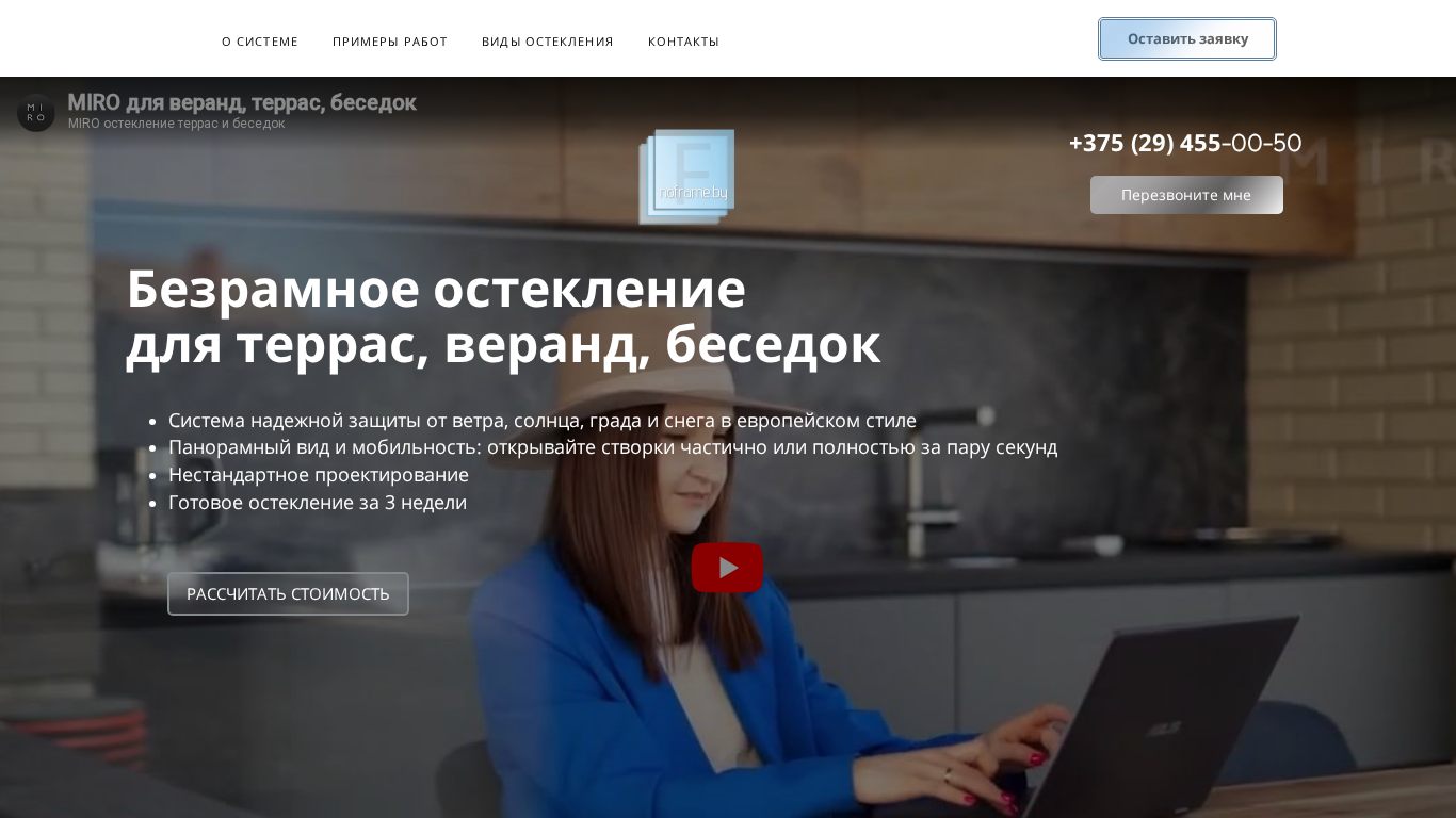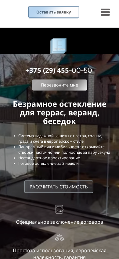 | AI-анализ | This online resource is dedicated to providing information about frameless glass solutions for terraces, verandas, and patios. The title "Безрамное остекление для террас, веранд, беседок" translates to "Frameless Glass Solutions for Terraces, Verandas, and Patios" in English. The website offers a system that ensures reliable protection from wind, sun, rain, and snow in an European style. The panoramic view and mobility of the system allow users to open the doors partially or fully within a few seconds. The website also mentions customizable designs and the ability to deliver the glass within three weeks. Users can request a quote by providing their name and phone number. The system is called MIRO and is suitable for various applications, including terraces, cafes, and restaurants. It can be installed without major renovations and allows for the covering |