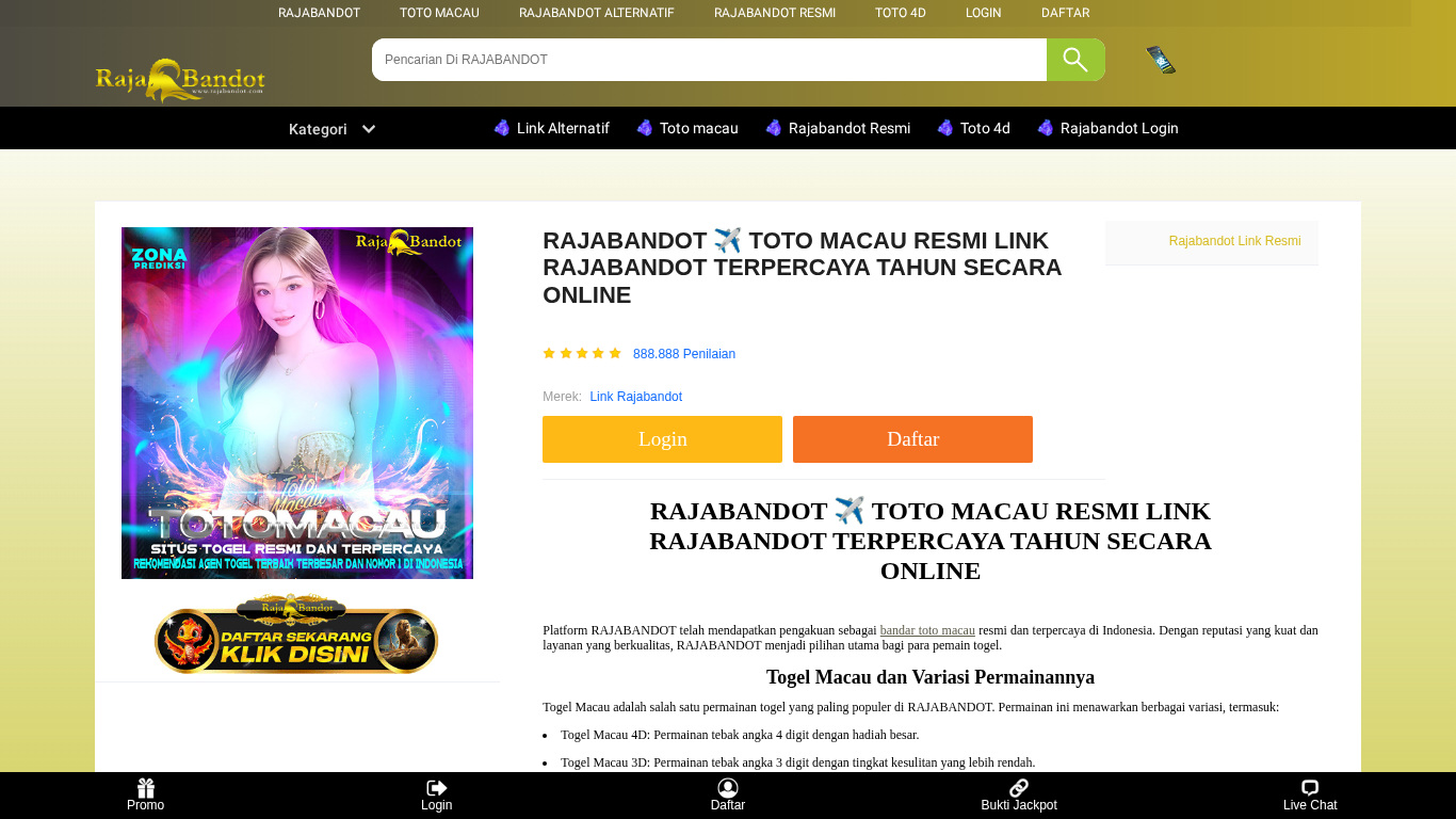 | SEO-описание | Selamat datang di RAJABANDOT, bandar Toto Macau resmi yang terpercaya di tahun 2025. Dengan menyediakan akses ke permainan togel Macau dengan bonus menarik dan sistem keamanan yang paling canggih dengan menjamin keamanan dan kenyamanan Anda dalam bermain. |
