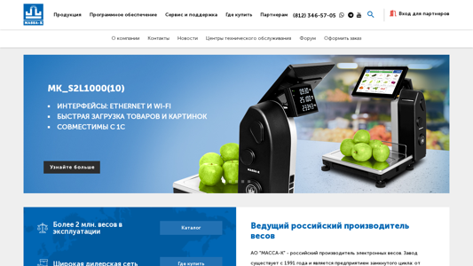 The portal 'Massa-K' is a Russian manufacturer and supplier of various types of electronic scales. The website offers modern electronic scales including floor scales, medical scales, scales for newborns, weighing cranes, platform scales, and laboratory scales. The scales are high precision and come with a three-year warranty from the manufacturer. Delivery is available to any region in Russia. The site contains sections for product information, programming software, customer service, and purchasing options. It also features a forum for customers and a section for news and company updates. The scales are compatible with 1C software and have Ethernet and Wi-Fi interfaces for quick data transfer. The site includes a catalog and a wide dealer network for purchasing options.