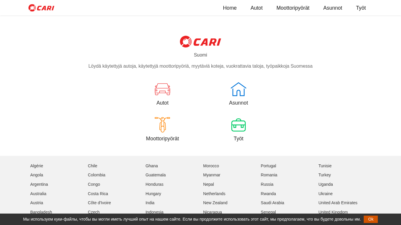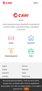 | AI-анализ | The web project "Cari.vip" is a multilingual platform for buying and selling used cars, motorbikes, houses, jobs, and other items in Finland. Users can navigate the menu that includes "Autos," "Moottoripyörät," "Asunnot," and "Työt." The site also offers options for filtering by country, including Finland, as well as other countries like Algeria, Argentina, Australia, Belgium, Bolivia, Brazil, Cambodia, Cameroon, Canada, Chile, Colombia, Costa Rica, Côte d'Ivoire, Czech Republic, Denmark, Germany, Dominican Republic, Ecuador, El Salvador, Ethiopia, Finland, France, Ghana, Guatemala, Honduras, Hungary, India, Indonesia, Ireland, Italy, Kazakhstan, Kenya, Malaysia, Mali, Mexico, Moç |