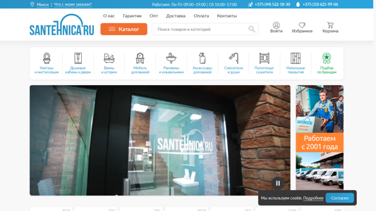 | AI-анализ | The website "Santehnica-Shop.by" is an e-commerce platform for selling sanitary ware in Minsk, Belarus. The site offers a wide range of products from various manufacturers at low prices. According to the description, the sanitary ware sold on this website is considered the most quality and reliable in Minsk. The website features a catalog with different brands, a shopping cart, and a contact section with phone numbers and an address in Minsk. The main categories of products include toilets, bidets, sinks, faucets, shower cabins and trays, water heaters, and cleaning and installation accessories. The website also has sections for mega sales, a showroom, and a blog. The website operates from Monday to Saturday from 9:00 to 19:00, and on Sundays from 10:00 to 17:0 |