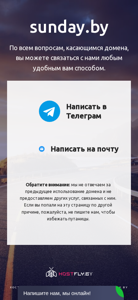 | AI-анализ | This website, titled "sunday.by Выставлен на продажу" (Sunday.by For Sale), is a domain sales page. Visitors can contact the owners for inquiries regarding the domain through Telegram or email. The website clarifies that they do not respond to queries concerning the previous use of the domain or associated services. Hostfly, a separate entity, is mentioned as a provider of website hosting and domain parking services.  |