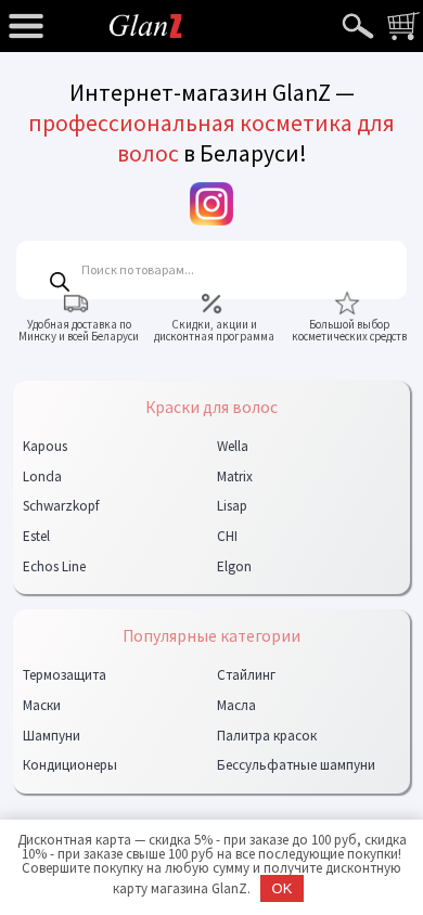 | SEO-описание | Интернет-магазин GlanZ, где вы можете купить профессиональную косметику для волос и ногтей с доставкой по Минску и Беларуси. |
