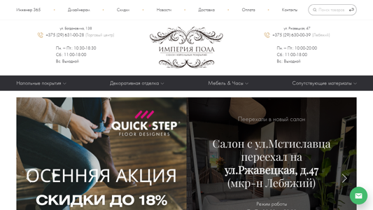 | AI-анализ | This website is a flooring sales platform in Minsk, Belarus, offering a wide range of flooring types including laminate, parquet, and probko. With over 15,000 items available, customers can easily browse through an accessible catalog featuring product photos and prices. Delivery services are provided across Belarus. The business has two locations: one at ul. Bogdanovich, 138, and another at ul. Rzhevskaya, 47. The operating hours are as follows: the first location is open from Monday to Saturday, 10:30 AM to 6:30 PM, and Sunday is a day off. The second location is open from Monday to Saturday, 10:00 AM to 8:00 PM, and Sunday is also a day off. The available flooring types include various types of l |