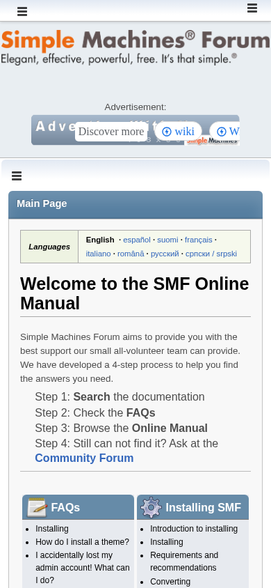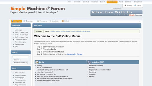 | AI-анализ | The web project "Online Manual" (wiki.simplemachines.org) is a user guide for Simple Machines Forum (SMF), a popular open-source online discussion platform. The site offers a comprehensive searchable database of documentation, FAQs, and tutorials to help users navigate the forum software, from installation and setup, to using features and customizations. The menu includes sections for downloads, modifications, and support, with options for English language users to log in and access the main pages for different SMF versions, as well as the community forum for further assistance. |