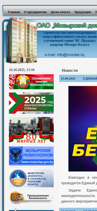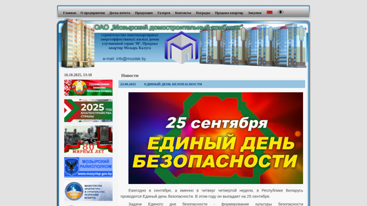 | AI-анализ | The website is the main page of the Mozirsky Domostroitelny Kombinat (Mozirsky Housing Construction Combine), which specializes in the production and construction of large-panel residential buildings. The website contains information about the company's history, management, administrative procedures, anti-corruption measures, union committee, and a notice board. The main content focuses on the sale and construction of energy-efficient multi-apartment buildings of the improved series '90'. The site also includes sections for news, contacts, and the sale of apartments in Mozir and Kaluga. The site contains information about various safety-related events such as the 'Day of Safety' and 'Week of Digital Safety'. There are also sections dedicated to the annual 'Construction Olymp' awards for outstanding achievements in the construction industry in Belarus. The site was last updated on October 16, 2025 |
