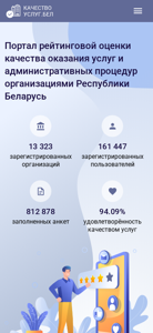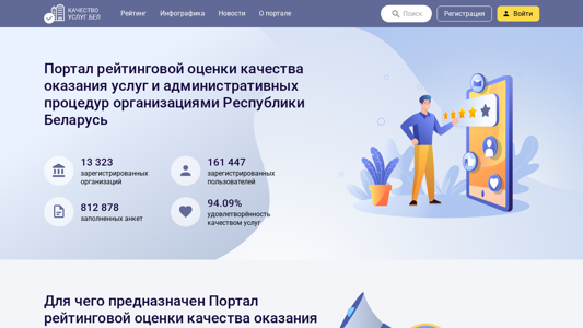 | AI-анализ | The portal "Rating Portal" is a website dedicated to evaluating the quality of services and administrative procedures provided by organizations in Belarus. With over 13,000 registered organizations and 161,447 registered users, the portal provides a platform for citizens to express their opinions on the quality of services rendered by government organizations. The resulting ratings of these organizations create a incentive for improvement in the delivery of government services and foster open dialogue between the government and the population. The portal covers various sectors including, but not limited to, archival activities, architecture and construction, military service registration, state registration of real estate and property transactions, state administration, citizenship and migration, income and taxes, food, recreation, housing and communal services, housing legal relations, healthcare, comprehensive technical maintenance and exploitation of buildings and objects, beauty, culture, education, and security services. The rating of organizations is based on |