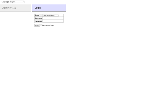 | AI-анализ | The website "Login - Adminer" is a login page for accessing the Adminer database management tool hosted on three different servers: blue.globenet.cz, olive.globenet.cz, and cartman.globenet.cz. Users are required to enter their Username and Password to gain access, and they can opt for a permanent login. The language of the interface can be changed to English, Arabic, Bulgarian, Bengali, Bosnian, Catalan, Czech, Danish, German, Greek, Spanish, Estonian, Persian, Finnish, French, Galician, Hebrew, Hungarian, Indonesian, Italian, Japanese, Georgian, Korean, Lithuanian, Malay, Dutch, Norwegian, Polish, Portuguese, Romanian, Russian, Slovak, Slovene, Serbian, Swedish, Tamil, Thai, Turkish, Ukrainian |