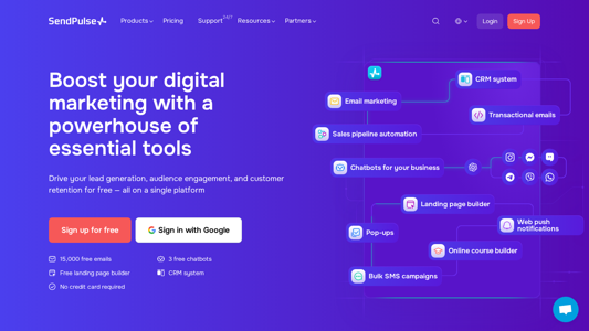 | AI-анализ | The web project "Multi-Channel Marketing Automation Platform | SendPulse" offers a platform with email, web push, SMS, and chatbots for Facebook, Telegram, WhatsApp, and Instagram. Users can combine these channels for marketing automation. The website provides tools for email campaigns, transactional emails, SMS notifications, web push notifications, and chatbots for various messaging apps. The platform also includes a CRM system and an online course builder. Users can create landing pages, pop-ups, and manage and sell CRM online. The website offers a free plan with 15,000 monthly emails, three free chatbots, and a free landing page builder. Additional features and integrations are available with paid plans. The website is available in multiple languages, including English, Deutsch, Español, Français, Italiano, Português, Türkç |
