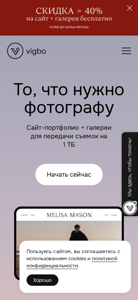 | SEO-описание | Vigbo — то, что нужно фотографу. Галереи для передачи съемок клиентам, создание сайта и магазина, блог — и всё в одном месте! Vigbo — первый сервис для фотографов, с 2011 года мы помогаем вам развиваться в любимом деле. Присоединяйтесь! |