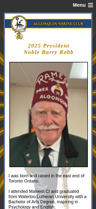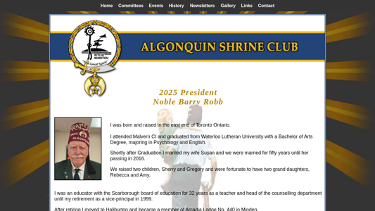 | AI-анализ | The website is for the Algonquin Shrine Club located in Bancroft, ON, Canada. The title and description of the website include references to the Algonquin Shriners and the Shrine Club of Bancroft. The keywords suggest that the website is related to the Algonquin Shrine Club and Bancroft Shriners. The top words indicate that there are sections on the website for committees, events, history, newsletters, and contact information. The text on the website provides a brief biography of the current president, Barry Robb, who was born and raised in Toronto, attended Waterloo Lutheran University, was an educator for 32 years, and has been a member of Arcadia Lodge No. 440 in Minden since retiring. He has served various roles in Masonry, including Master of the Lodge three |