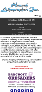 | AI-анализ | The portal hanlit.com is a business website for Hannah Lithographers Inc., a printing company located in Bancroft, Ontario. The site offers various printing services including offset and digital printing. The description mentions two offset presses, two colour copiers, and a black laser high speed copier. Additional services include graphic design, binding, collating, folding, numbering, perforations, scoring, and trimming. The website also provides hosting and domain name registration, as well as photography services for passport, citizenship, and firearms (PAL) photos. The domain name costs between $18.00 and $25.00 per year, and hosting costs $95.00 per year with up to 10 email addresses and unlimited storage space. Site creation pricing is not specified in the provided data. The site is mobile web friendly and offers e-commerce |