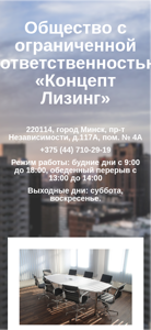 | AI-анализ | The web project "Concept Leasing" is a limited liability company located in Minsk, Belarus, offering a full range of leasing services for legal entities. The company specializes in financial, return, import, and international leasing, with financing terms tailored to individual client needs. The contact details provided include an address on Independence Avenue, a phone number, and business hours. The company's registration number and documents, such as the certificate of inclusion in the National Bank of Belarus' leasing organizations registry, are also listed. The types of leasing, duration, down payment, and additional security arrangements are customizable. The currency for financing is the Belarusian Ruble, Euro, or US Dollar, and the buyback price ranges from 1% to 25% of the leased item's value. |