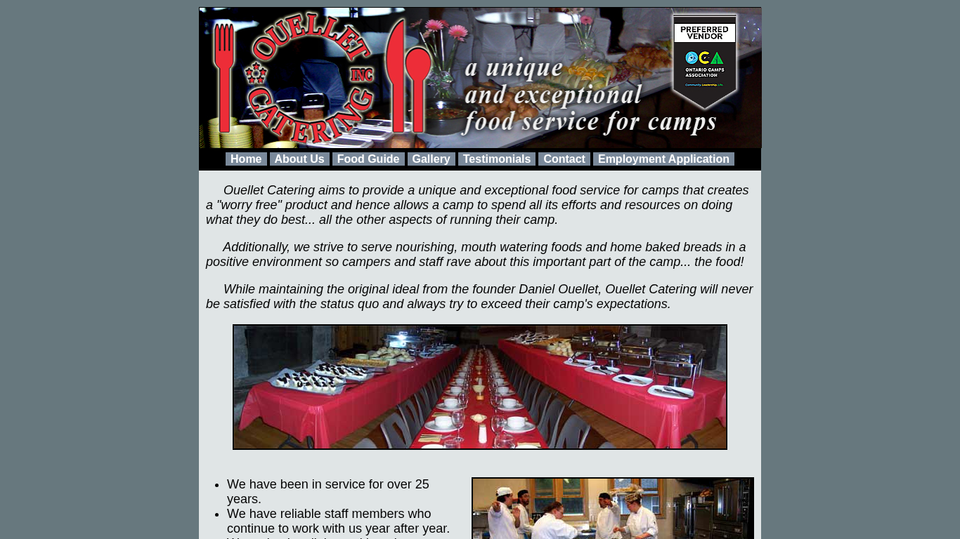 | AI-анализ | language: English location: Canada The website, Ouellet Catering Inc., is a food service company that has been catering to summer camps for the past 18 years. The website provides information about the company's history, food offerings, and services. It also includes a gallery, testimonials, and an employment application. Ouellet Catering aims to provide a unique and exceptional food service for camps, allowing them to focus on their operations without worrying about the food. The company prides itself on serving nourishing, mouth watering foods and home baked breads in a positive environment. Ouellet Catering has been in service for over 25 years and has a reliable staff, with some members working year after year. The company maintains a liaison with cooking schools for new staff selection and offers comprehensive training programs. The website is maintained in English and is located in Canada |